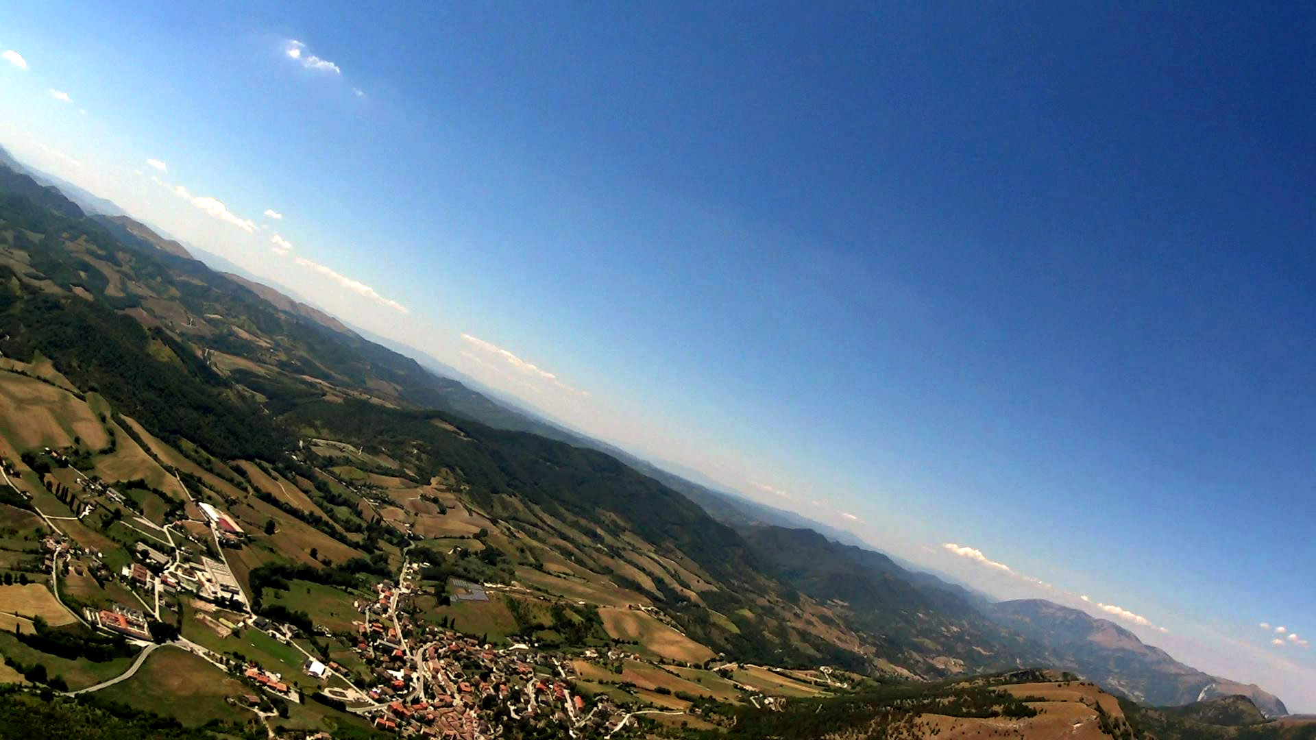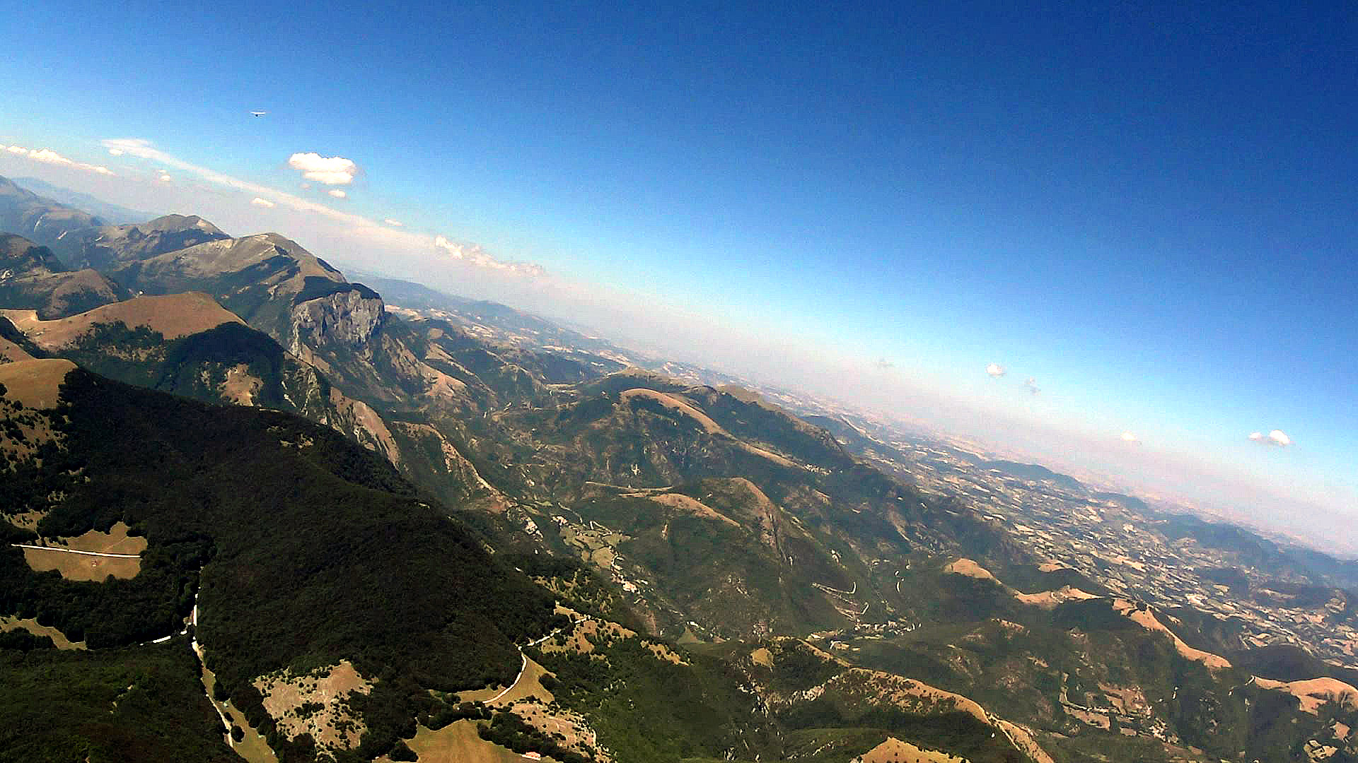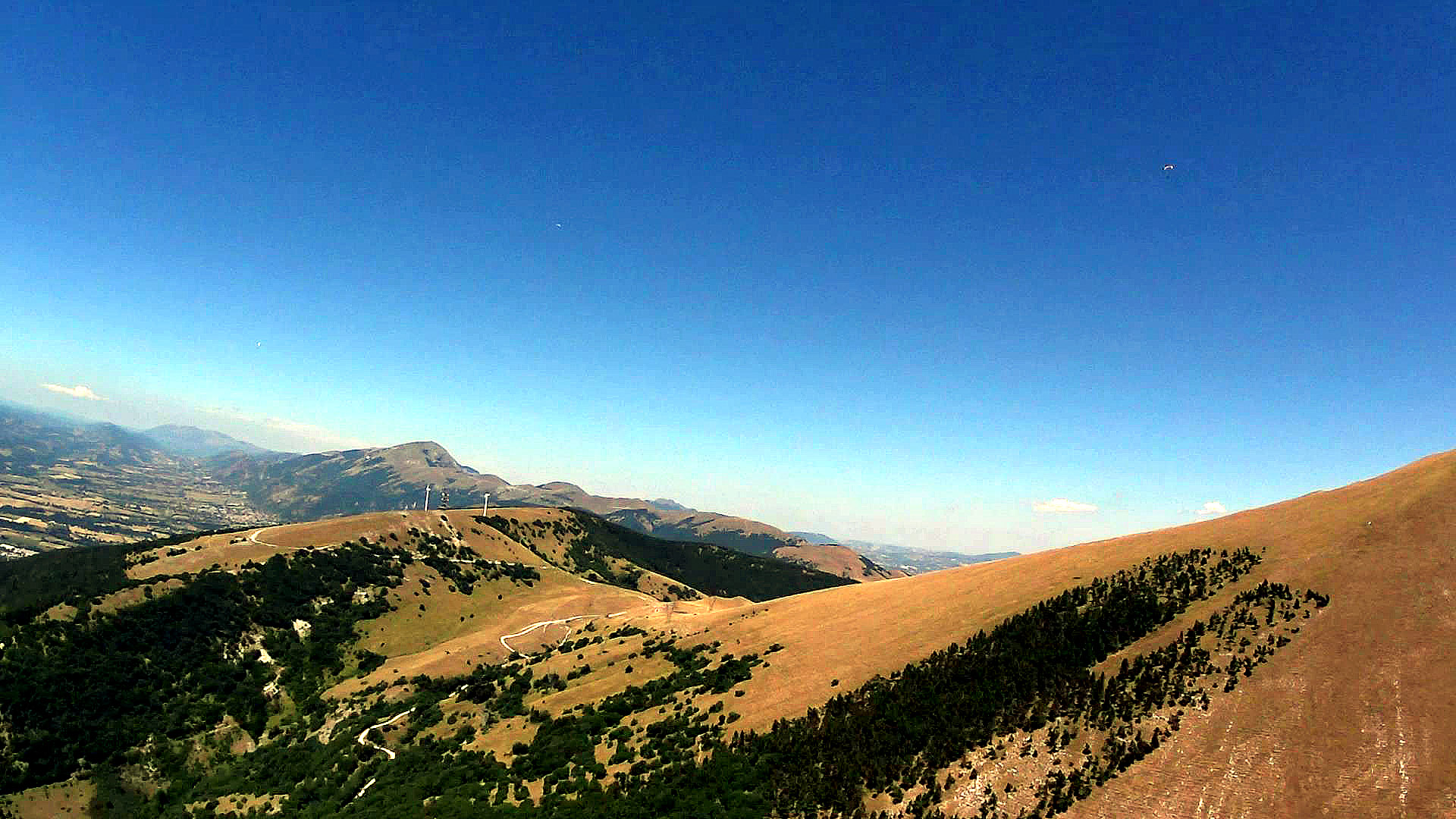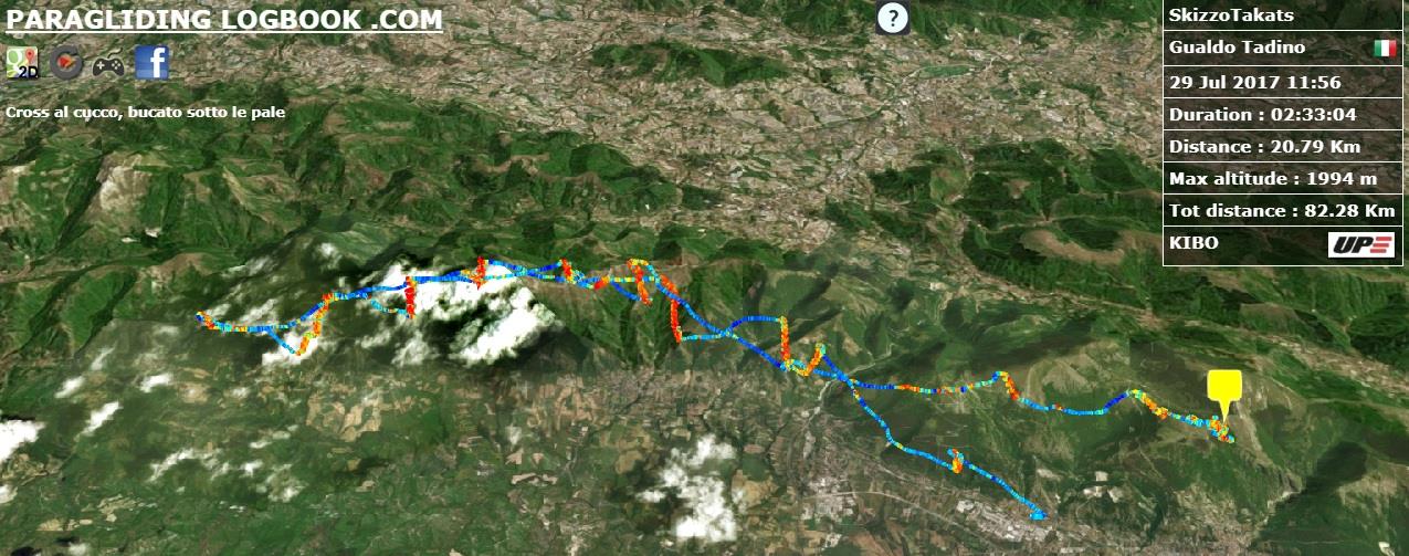 Saluto gli amici in termica e proseguo a sud est, al decollo del cucco sto a 1600, sotto vedo sempre Stefano Venturi che gioca… mammamia non tiene nulla, inoltre trovo delle turbolenze molto forti tanto da farmi chiudere le gambe, pronto a una chiusura da un momento all’altro.. invece la mia fida Kibo ha resisto benissimo, certo pure la scimmia sotto le bretelle un po’ di merito ce l’ha, più di una volta mi sono visto la vela davanti prima e dietro poi, il pilotaggio attivo ha evitato il peggio, vado avanti, passo il lepre e trovo una termichetta che stranamente mi scarroccia a sud.. meglio è proprio quello che mi serve.. supero il vallone davanti a Sigillo a e trovo termica sulla cresta del monte poggio alto, girandola mi ri-scarroccia a nord est, ma i valori sono buoni e val la pena girarla sto a 1440 e mi serve benzina, giro un bel +1.6/2.0 e mi porta rapidamente a quasi 2000 metri e mi sento molto soddisfatto.
