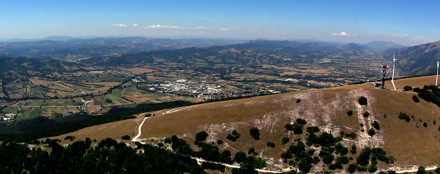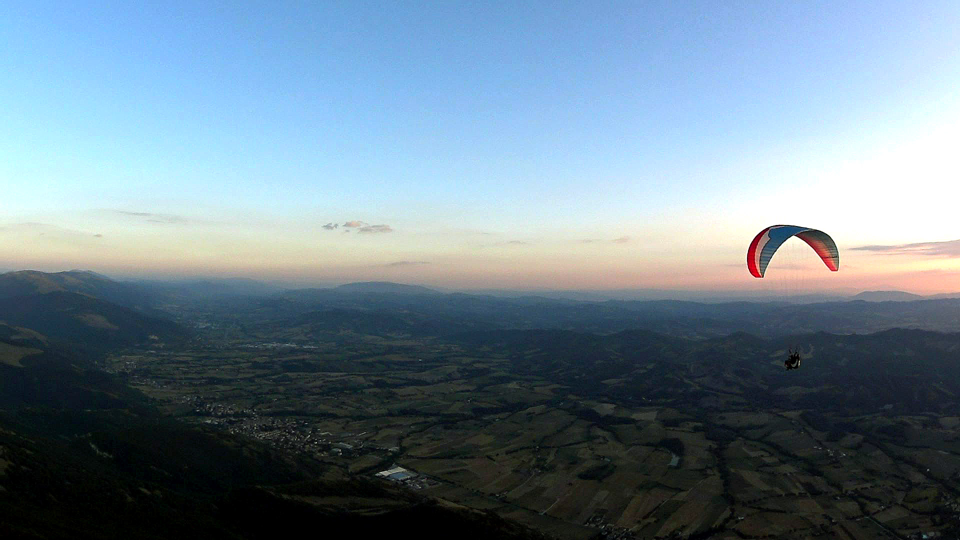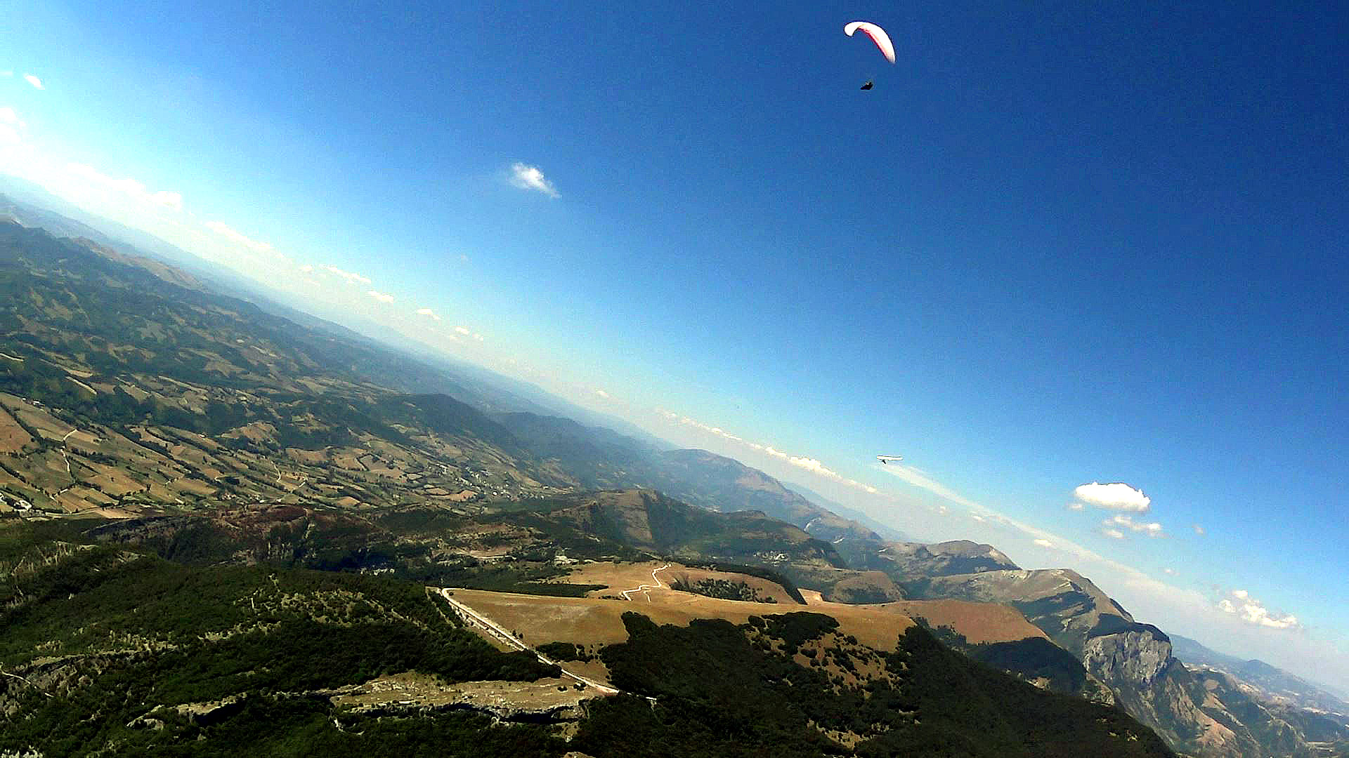 Per questo volo la mia boa nord è scheggia, le mie colonne d’ercole oggi sono li.. arrivo all’inizio del monte bassino, sto a 1100 metri, vedo nella conca quello stabilimento, che non ho mai capito cosa sia, proseguo sul costone perdendo ulteriormente quota, arrivando a 1000 metri, vicino alla croce del monte calvario, a sud si scheggia, li trovo termica, molto più alto di me trovo pure Matteo, dietro di me vedo una vela skywalk credo sia un chili 4 blu arancio bianco, pure lui è bassino e sta tribolando, arrivato alla croce trovo subito termica..la giro e mi porta a nord facendomi arrivare a 1200 metri, 200 metri guadagnati, mi dico, esco dalla termica, e vado a sud, davanti a Costa San Savino, sto di nuovo a 1000 metri.. mamma mia, la termica più inutile che abbia mai girato, con un 180, e ho perso tutta la quota.. vabbè stacce mi dico… esco in valle un po’ visto che è c’è un bel vallone con discendenze garantite, e lo supero e arrivo al dentone di pielarocca basso basso a 850 metri, 200 metri sul terreno.. già sto cercando un campo dove bucare, maledizione.. poi il vario inizia a suonare, mi concentro, il valore è piccolo, è normale stiamo vicino a terra, giro questo +1.1 e giro dopo giro piano piano arrivo 1050 metri, vedo il chili arancio blu che sta più interno ma un po’ più a sud, punto a sud e trovo la sua termica scarrocciata verso valle, giro e arrivo a 1300.. sto di nuovo sul piano dove si decolla quando al cucco il vento è forte.. cerco la dinamica.. ma non la trovo trovo invece della bella turbolenza, mi ricordavo che il vento era parecchio da sud, vedo davanti la montagna, sopra me bello alto vedo Gaetano, andato in volo in direzione scheggia, io basso invece temendo un sottovento allargo verso valle, perdo inesorabilmente quota, sto a 1100 di nuovo.. ma mi sono avvicinato.. inoltre avanzo verso sud est a 19/20 orari.. pensavo peggio visto che all’andata stavo a 35/40, termica poi la trovo quello che credo sia la crestina di Costacciaro, ricordavo questo dal bel post che mi scrisse qualche tempo fa Stefano Bellapadrona, che peraltro ho visto quando stavo tribolando a sud di scheggia, bene la termica di servizio sulla crestina mi ha fare ben 1750 metri!!.. ora sono pronto per il traverso verso il cucco, superando il vallone davanti Costacciaro, arrivo davanti il cucco con 1520, trovo Stefano Valgimigli che gira assieme a una bellissima ala rigida, mi unisco a loro, anche se l’ala rigida mi mette un po’ paura, riesco a fare i 1900 sul cucco.